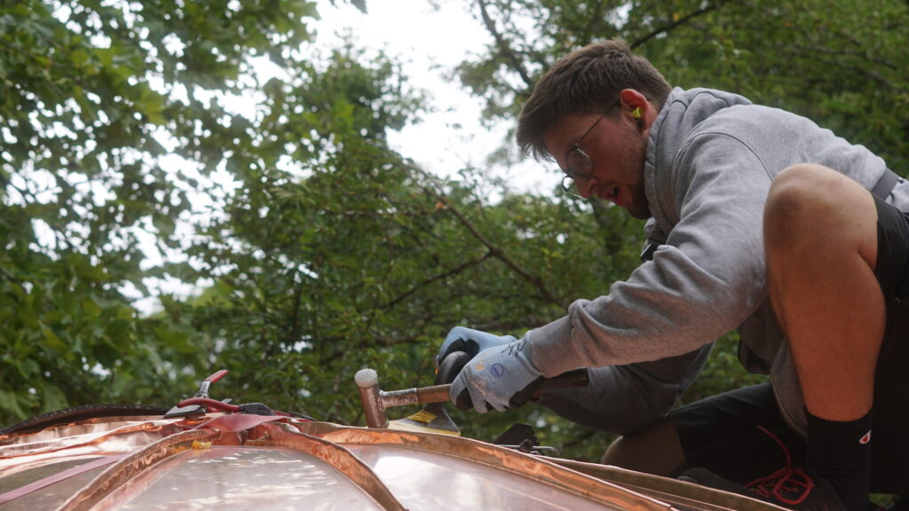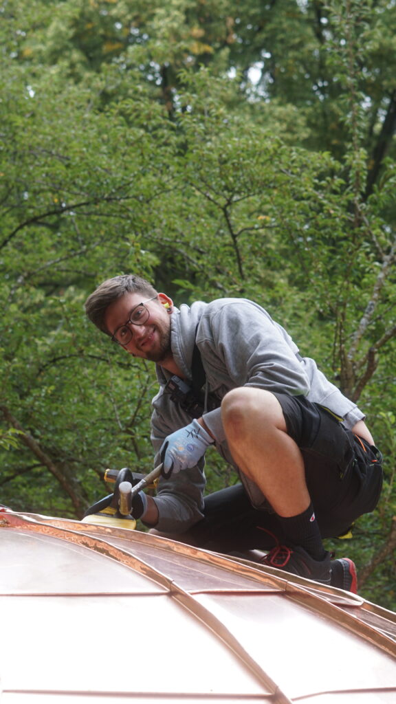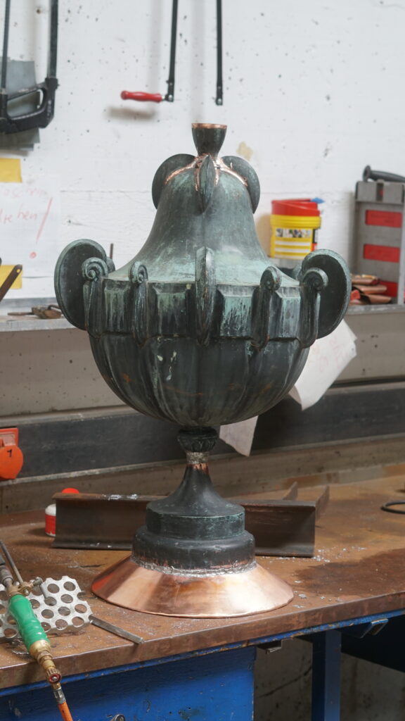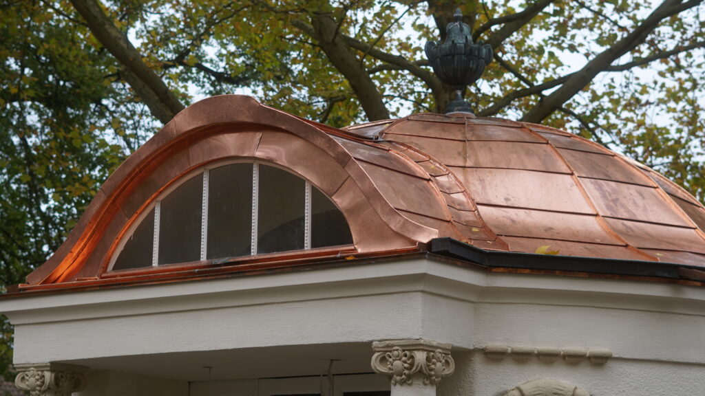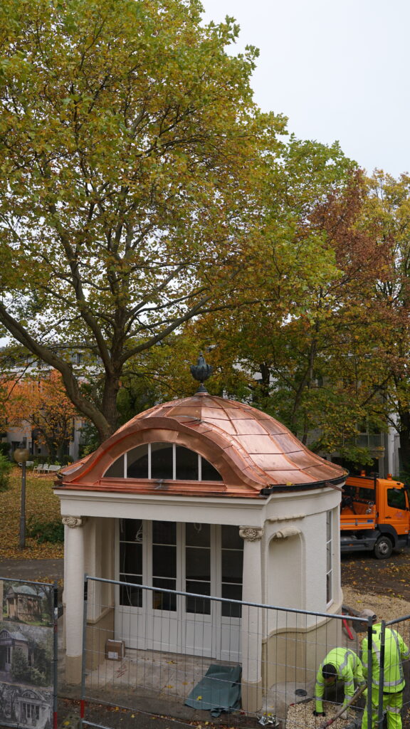Die Kupferbleche wurden nach historischen Vorlagen neu eingeteilt, mit Quer- und Längsfalzen versehen und die Hinterlüftung dezent integriert. Umlaufende Abtropfbleche und angepasste Kastenrinnen sorgen nun für eine optimale Wasserableitung. Der urnenförmige Dachaufsatz wurde repariert, verstärkt und zusätzlich mit einem konischen Sockel als Lüftungsauslass versehen. Alle Befestigungselemente konnten wiederverwendet werden, wodurch der ursprüngliche Charakter des Pavillons erhalten blieb.