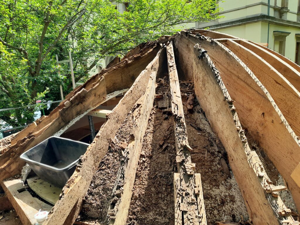 Bei diesem spannenden Projekt durfte unser Team die historische Dachkonstruktion des Pavillons in der Villa Laiblin fachgerecht sanieren. Zunächst wurden die alte Dacheindeckung, die Dachrinne und der Dachaufsatz demontiert. Wiederverwendbare Teile wurden sorgfältig überarbeitet und anschließend fachgerecht wieder montiert.